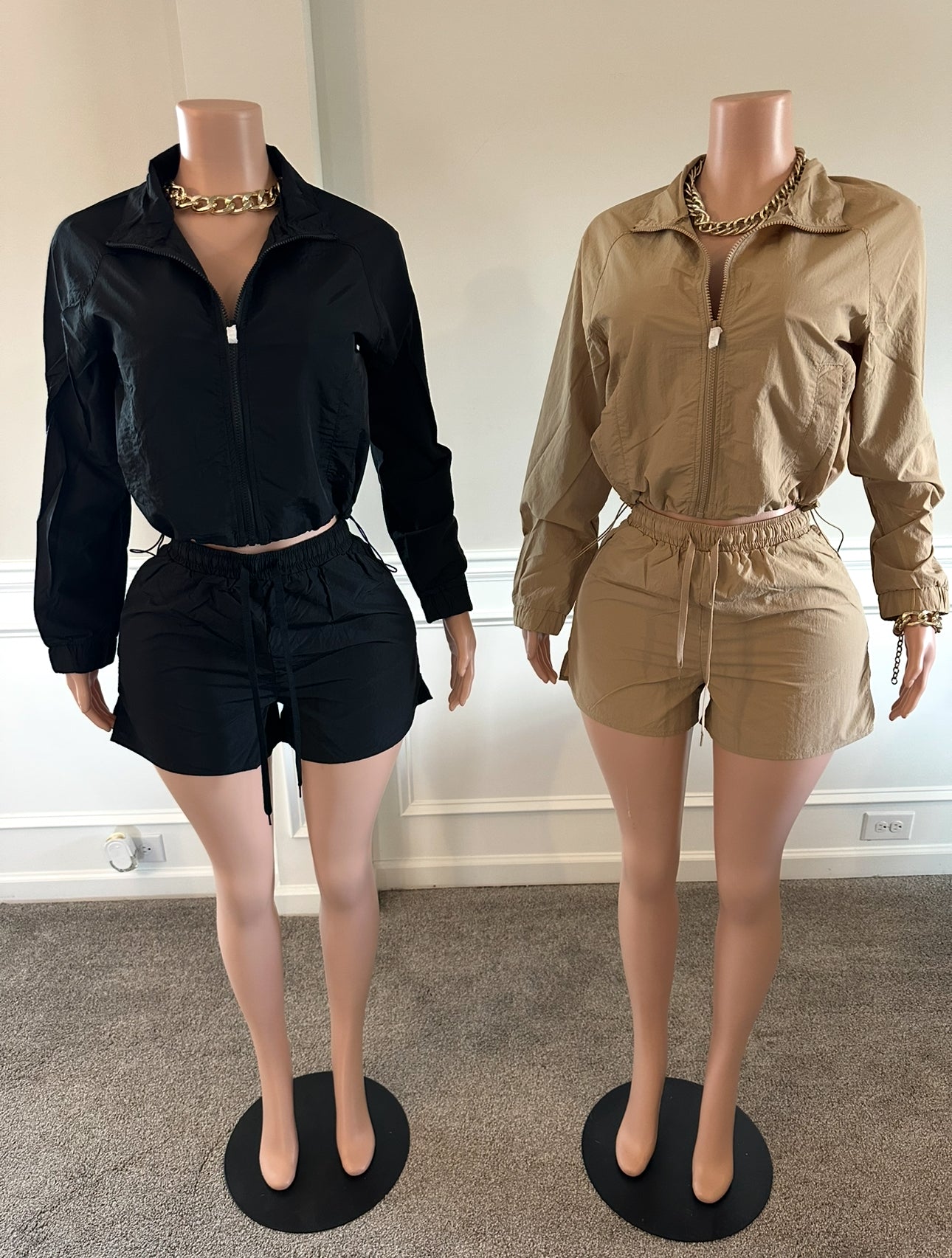 Zip Up Jacket Set Drawstring short Travel Track Suit windbreaker set. The lightweight zip-up jacket pairs perfectly with matching high-waisted drawstring shorts for a coordinated look.